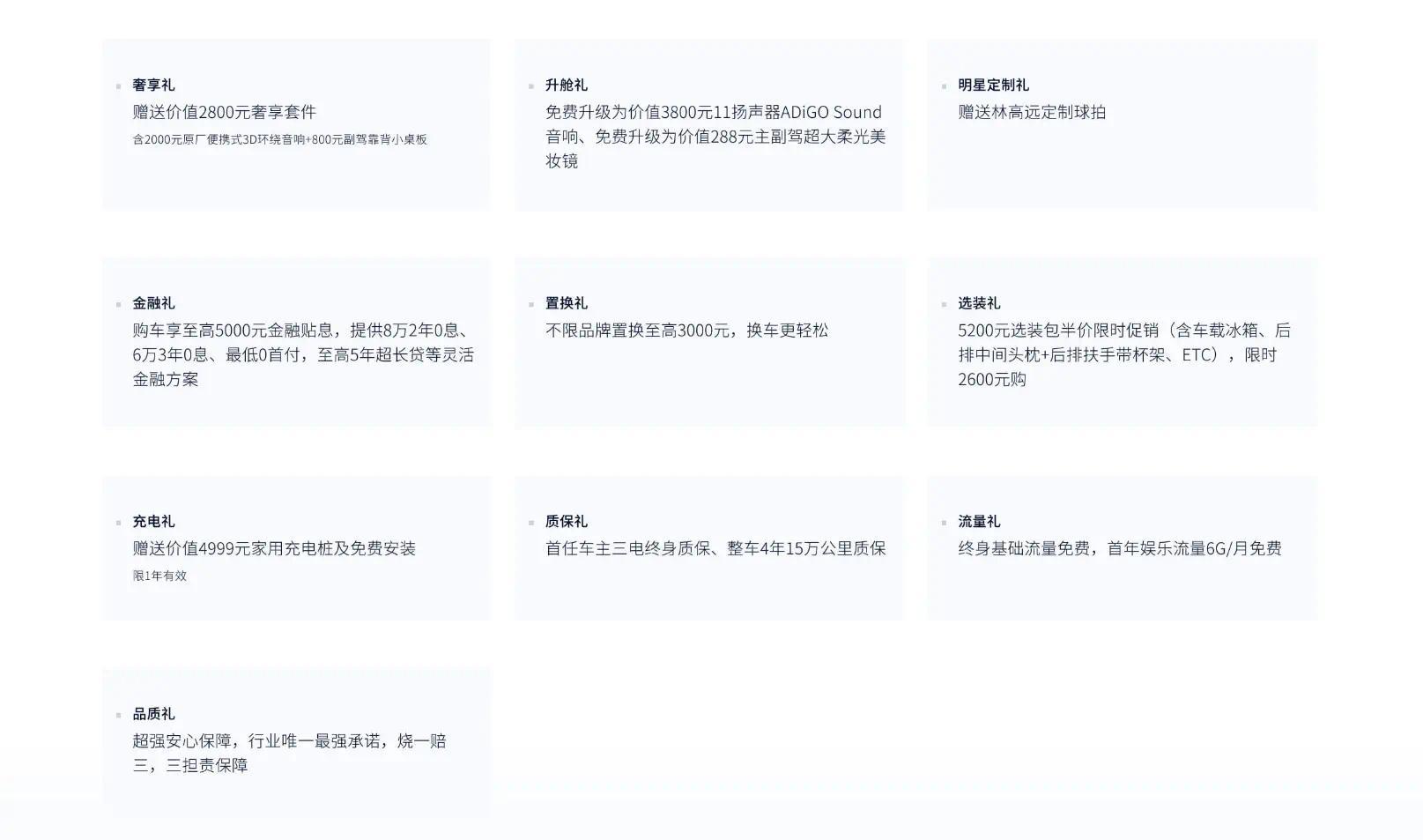 另外,新车的权益也非常不错,比如升级音响、8万2年0息、6万3年0息、赠送充电桩及安装服务等,不足就是整车质保只有4年15万。当然,新车的整体权益还是非常不错的。