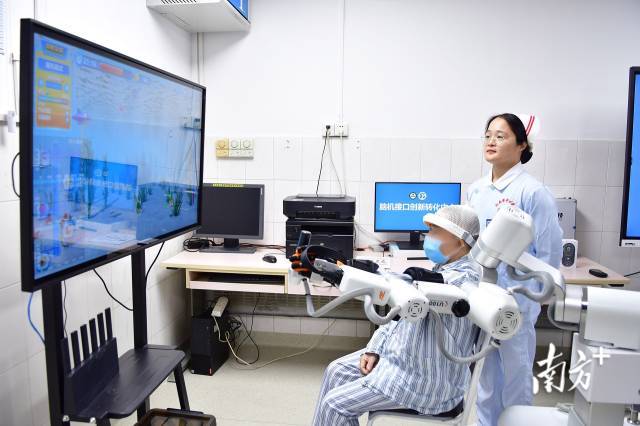 当天下午,汕头市中心医院门急诊大楼前,一辆5G脑心动车吸引了群众围观体验。群众登上脑心动车,将布满传感器的“头套”戴上大脑,机器就能准确识别出10年后脑内病理。另一边,在该院神经外科一病区里,三位神经外科术后无法完全自如运动的病人,正分别体验着3种不同的康复机器人,在机器的指引下想象躯体运动,并在机器帮助下实现运动康复。这些令人大开眼界的现象,让群众直呼“黑科技”。这正是前沿的科技产品——脑机接口。