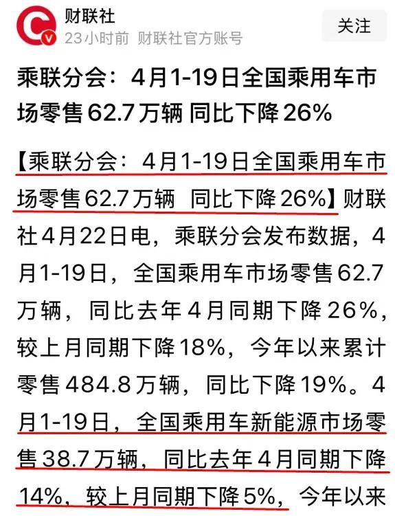 《财联社》引述乘联分会的数据指出,4月1日至19日国内的汽车零售量下滑26%,而电车的下滑幅度仅为14%,由此一举将电车渗透率提高到六成以上,这意味着外资车今年初以来发起的价格战失败了。