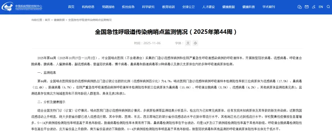 据中国疾控中心2025年第44周中国流感监测周报及全国急性呼吸道传染病哨点监测情况显示,监测期内(10月27日-11月2日),全国共报告347起流感样病例暴发疫情,与上一监测周的144起相比大幅增加。学校聚集性疫情报告显著增多,5~14岁病例组检测阳性率明显高于其他年龄组。