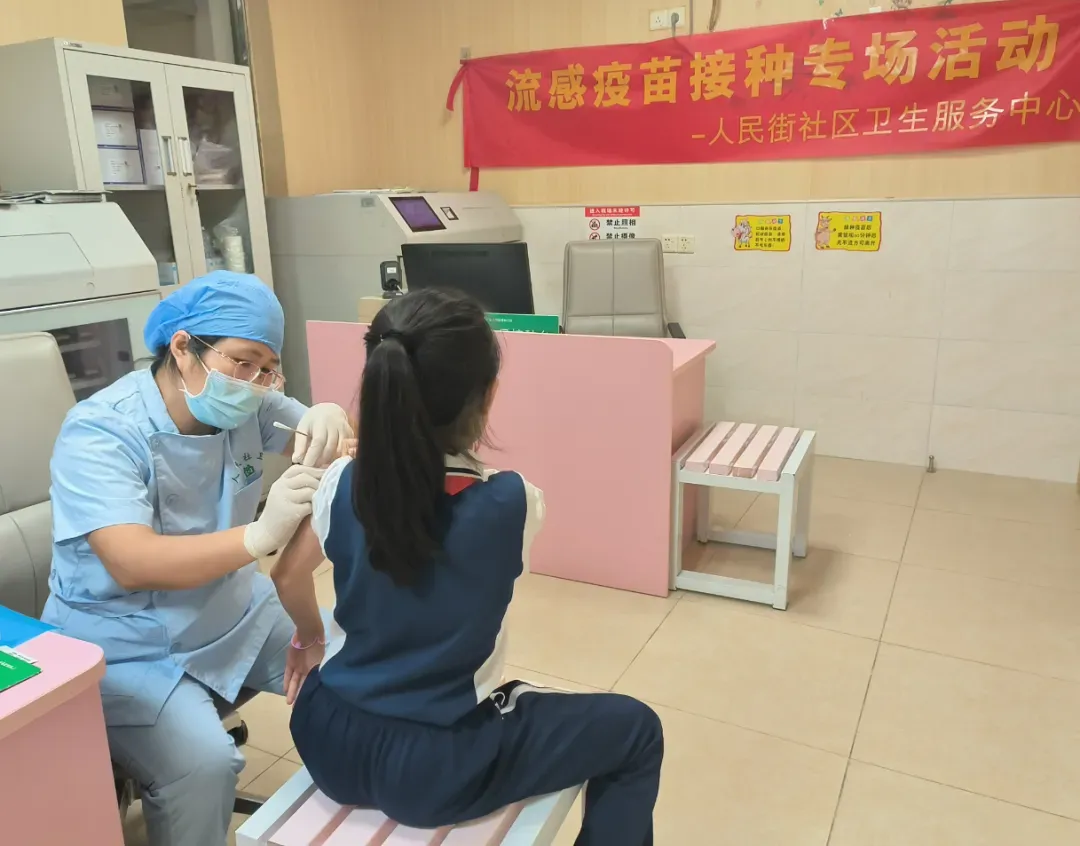 ▲人民街社区卫生服务中心举办流感疫苗接种专场活动,为学生接种