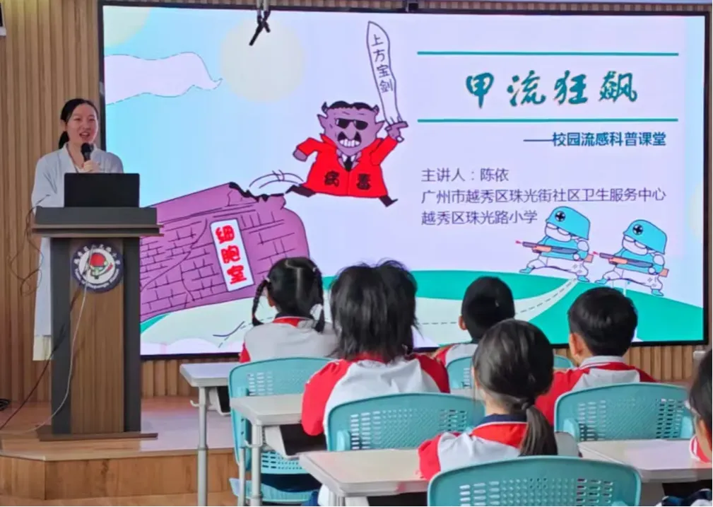 ▲流感防控科普课堂走进珠光路小学(授课者:珠光街社区卫生服务中心陈依,曾获“越秀工匠杯”2025年预防接种科普讲解大赛一等奖)