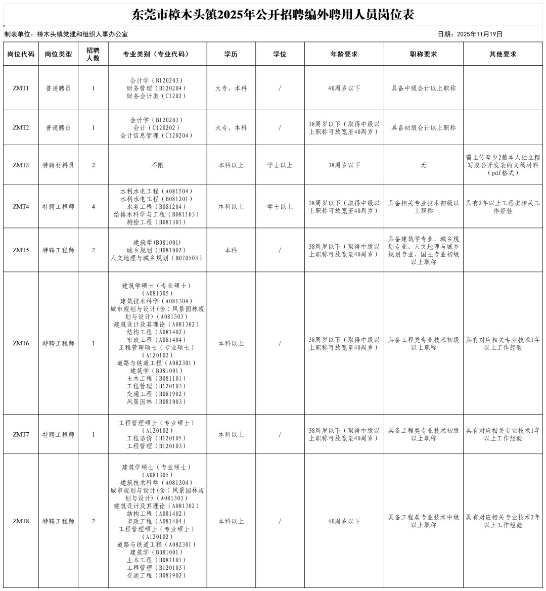 本次招聘编外聘用人员共14名,具体岗位要求详见《东莞市樟木头镇2025年公开招聘编外聘用人员岗位表》(附件1)