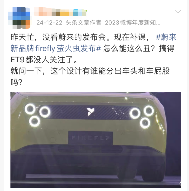 六眼飞鱼、太丑了、蔚来在搞什么等恶评比比皆是。当晚,萤火虫没花一分钱,冲上微博热搜第一。评论区几乎找不到一条夸奖,清一色的嘲讽、质疑、看衰。对于任何一个新品牌而言,这都是一场噩梦级别的“天崩开局”。