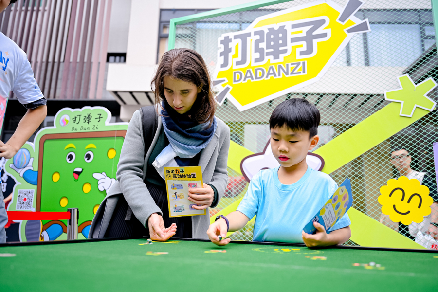 不仅如此,现场还有充满未来感的“九子家族元气宇宙”互动装置。该装置以“元气星核”为概念,通过代表顶核子、跳筋子等传统项目的九颗“星球”组成星环,将熟悉的弄堂游戏幻化为星际景观,不仅让居民在互动中解锁运动乐趣,更寓意着社区健康建设在传承传统运动智慧的基础上,正朝着更具包容性、更贴近居民需求的未来迈进,让“健康生活在社区”的理念深入人心。